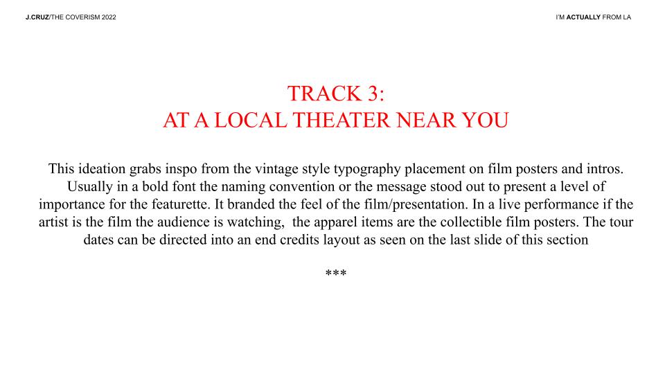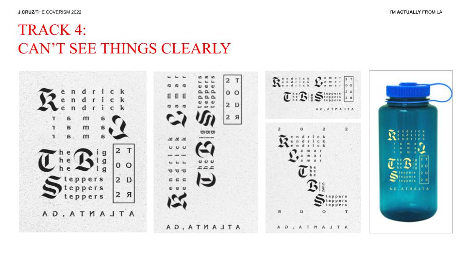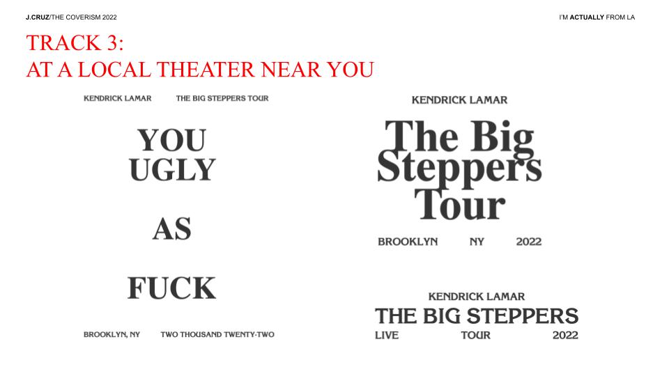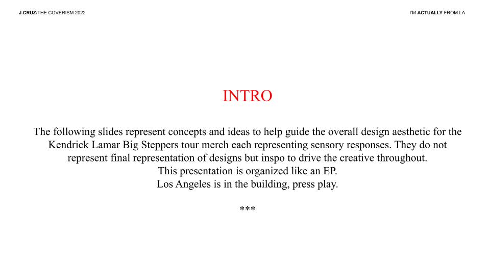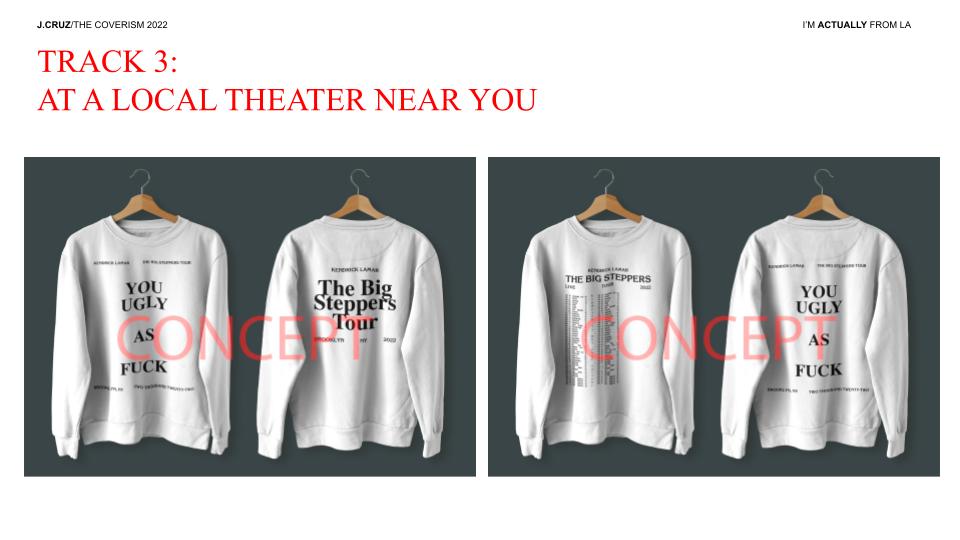 As a Consultant, I explored creative lanes of merchandise for Kendrick Lamar’s MM and the BS tour. Collaborating with pgLang and Union LA, I presented design concepts that included typography with L.A.s cultural relevance, and used album quotes to create striking apparel.